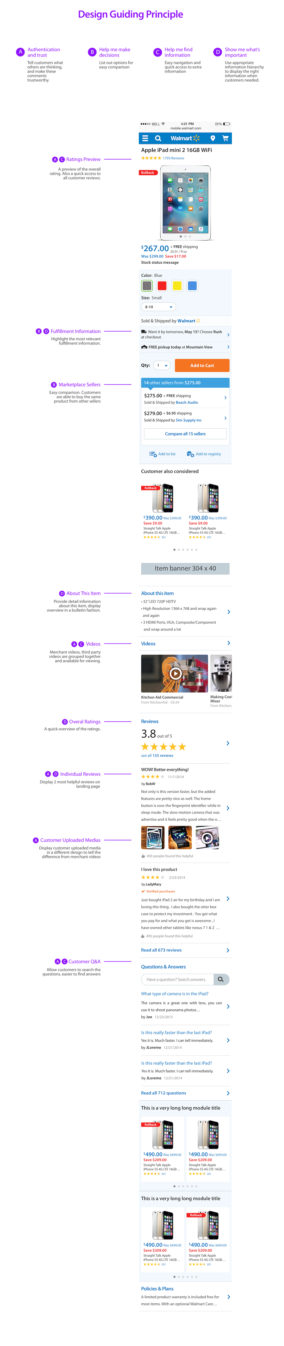 There are two sides of users involved in this experience, the Reviewers and the Shoppers. I identified the needs of both users type: Reviewers need to quickly fill out the form by leaving their genuine opinion of the items they purchased; Shoppers want authentic information from the reviewer to help them make decisions; I married both users needs with better review form design and a nicely presented UGC panel on the items page.